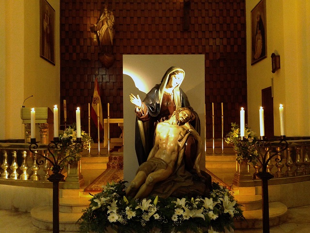 Tras el rezo del rosario se hizo una ofrenda floral y se cantó la salve. El rosario que organizamos tiene entre otras virtudes el recogimiento que intentamos conseguir ante la imagen de la Virgen de la Piedad en su capilla. Con luz tenue y silencio se crea un clima adecuado para la oración.